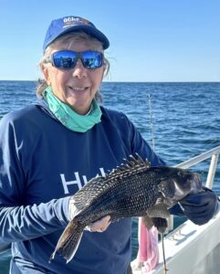 Cathy had her brand new non-skunk replacement rod rigged and ready. It had somehow grown a new level wind reel overnight. Never know what will happen if you leave a bunch of tackle in a dark place. Shoot, let em go unsupervised long enough and suddenly there’s no room on the boat or in the garage. Wish fishery managers would similarly consider means of increasing sea bass spawning production (if perhaps from a more fact based perspective!)