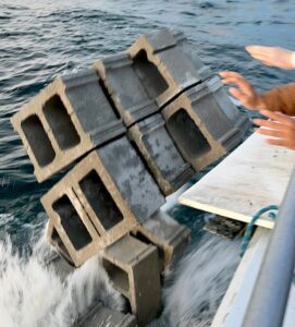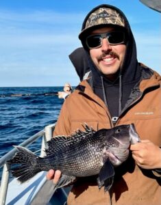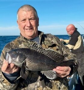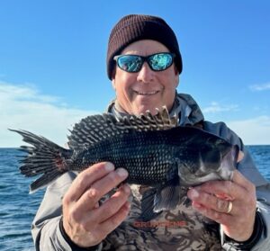Marina basin still as glass, we tied her loose with a light rail and headed seaward. Hunter & Andrew sent thirty reef blocks down to Murphy’s Landing Craft Reef where they’ll coral up in a decade or so. Weatherman told yet another tall tale, of course. I ought to know by now that when they call for a NW wind to blow overnight and fall out to near-nothing after dawn – they’re lying. NW winds seem to never decrease early – they increase. With N winds a steady 19 and gusting, we found heavy weeding in the black sea bass garden this morning. Just enough nice keepers to hold folks at the rail. Worked too. With winds at last falling out to under 10 knots; George limited out first followed by Chuck, then everyone – a boat limit. Hunter used his reef builder’s karma to take the pool. That makes four trips in a row a block pusher has claimed the heaviest fish money. Hmmm.. Yeah, naw. Makes it fun though. Cheers, Monty