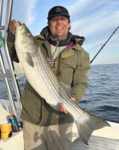Dave Weller and Jeff Weeks headed out to the inshore lumps 9-12 miles off the beach in search of bluefin tuna today and though they saw the fish on the surface they couldn’t get any tuna bites. They did get some bites from some stud striped bass, however. The guys released 6 big stripers from 38″ all the way to 50″ that ate a combination of ballyhoo and Nomad lures meant for big bluefin tuna.