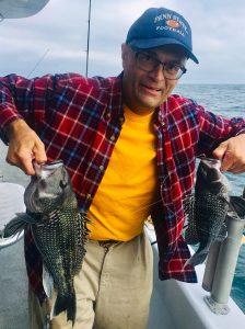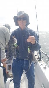 Didn’t mark many sea bass at my first drop. That’s really unusual for October. Did see what appeared a very large shark – a huge single mark. Have witnessed this many times before; where sea bass will reef-up tightly when predators are about. Whoever was living on that reef wasn’t having any part of our clams and squid. Quickly picked up and tried another spot where we limited out.