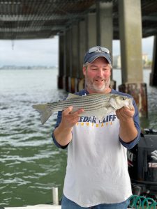 I saw Captain Wayne Blanks of Bayside Guide Service at the route 50 bridge today and he was also catching and releasing some small rockfish. One fish just missed the mark at 27″.