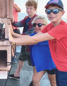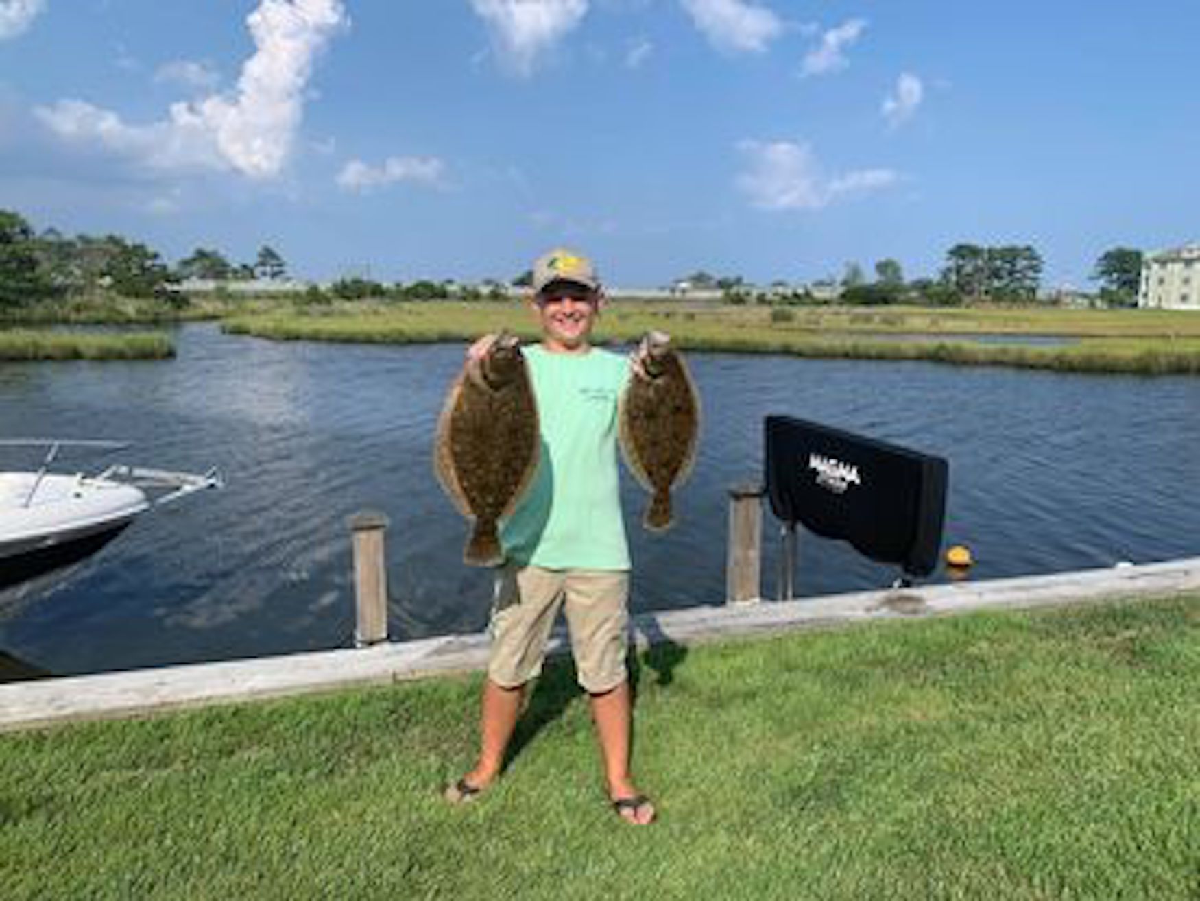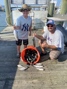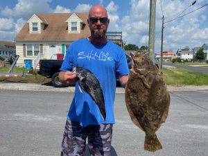 Mason McDaniel caught these two keeper flounder of 16.5″ and 20″ while drifting the west channel with his uncle Chris Clasing.