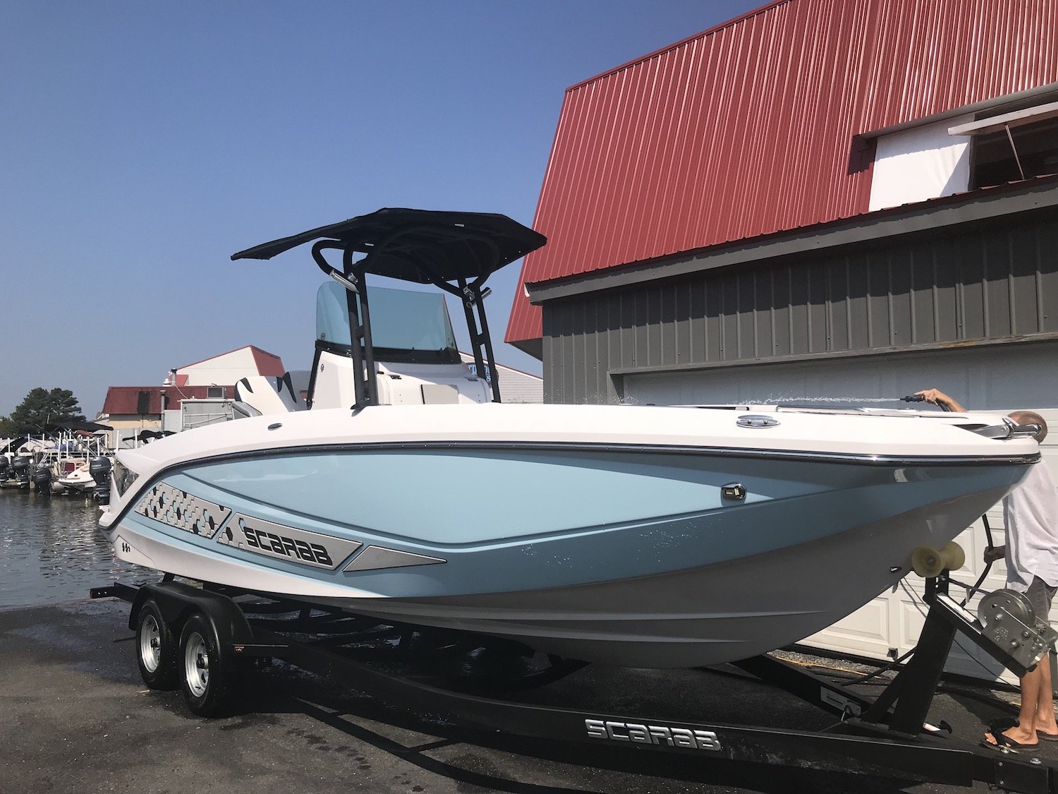 After our pontoon trip Ryan and I joined Island Watersports owner Mike Ferrari on a sea trial aboard a 25′ Scarab Open that is absolutely sick! This boat is a hybrid between a high performance jet boat and a center console fishing boat that Scarab has absolutely nailed. First I’ll give you the specs…..overall length is 25′, the beam is 8′ 4″, fuel capacity is 56 gallons, person capacity is 13 or 2100 lbs and it only draws 15″ of water.