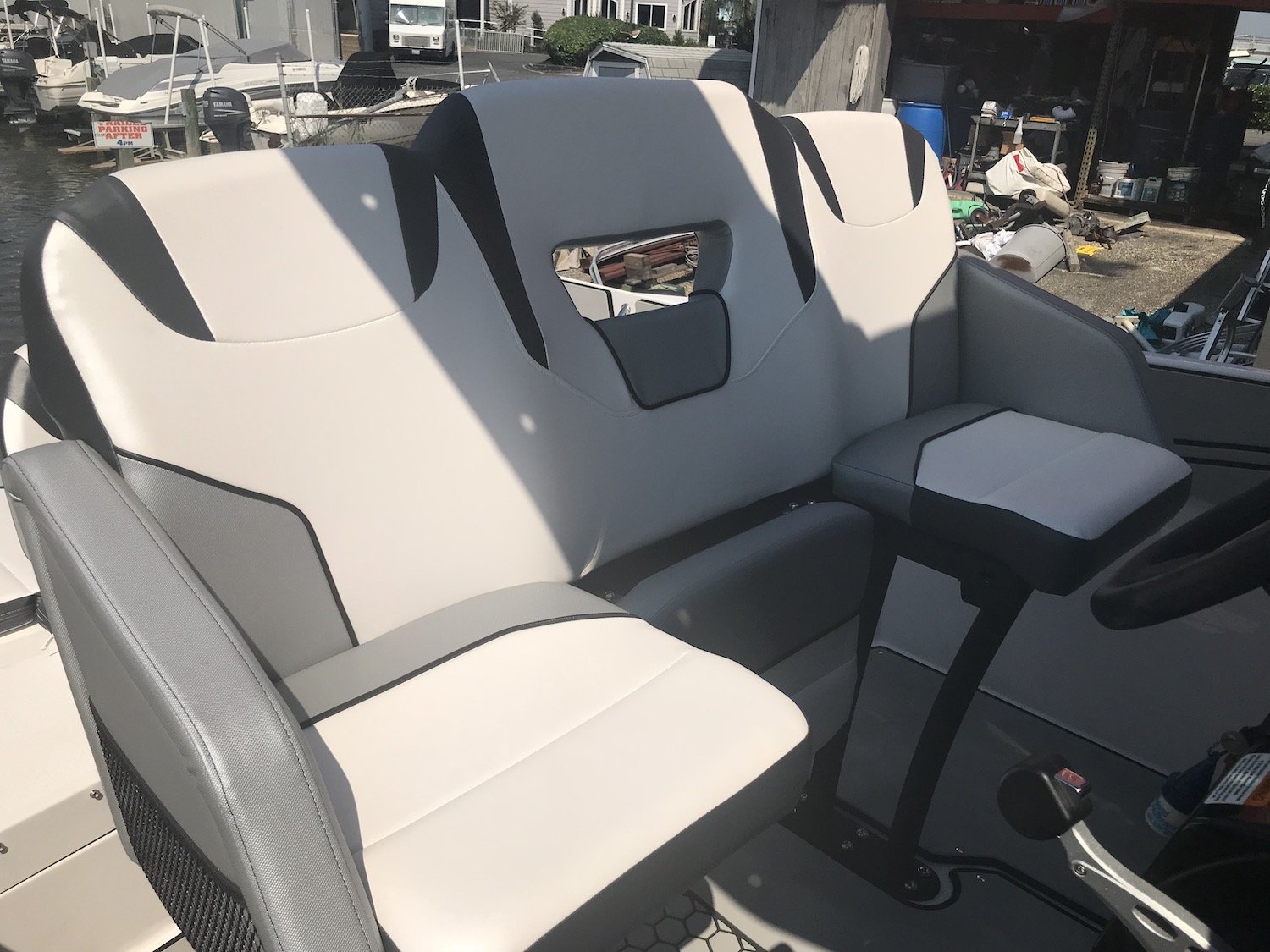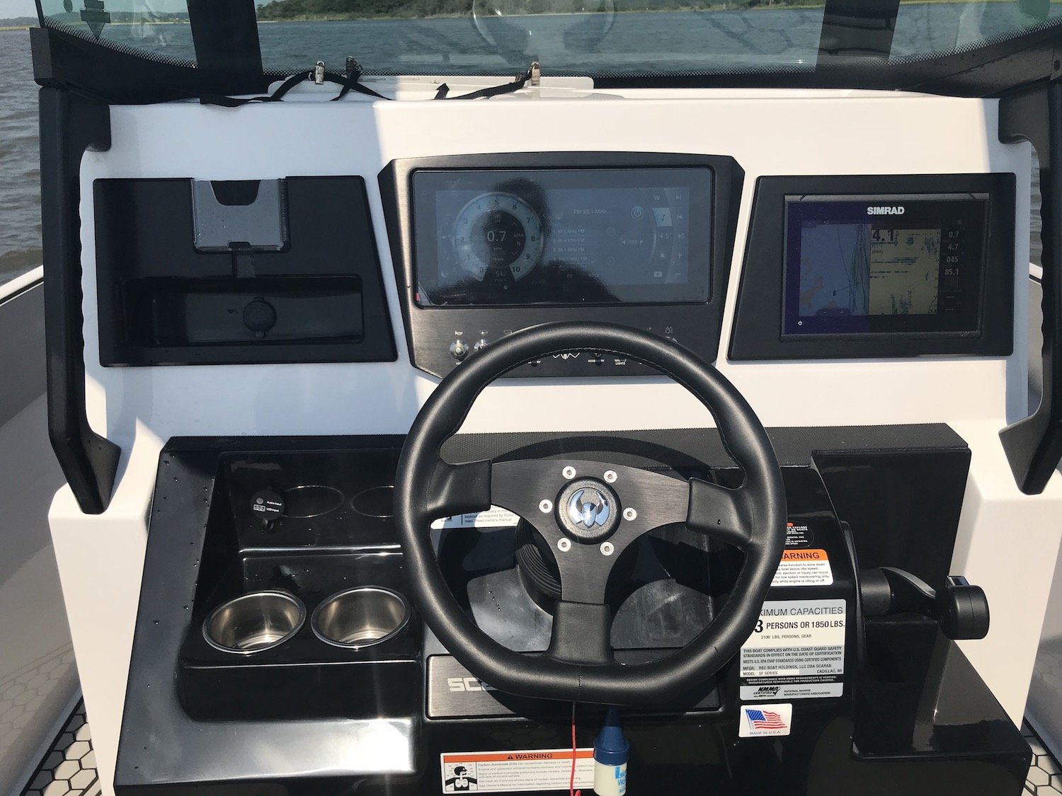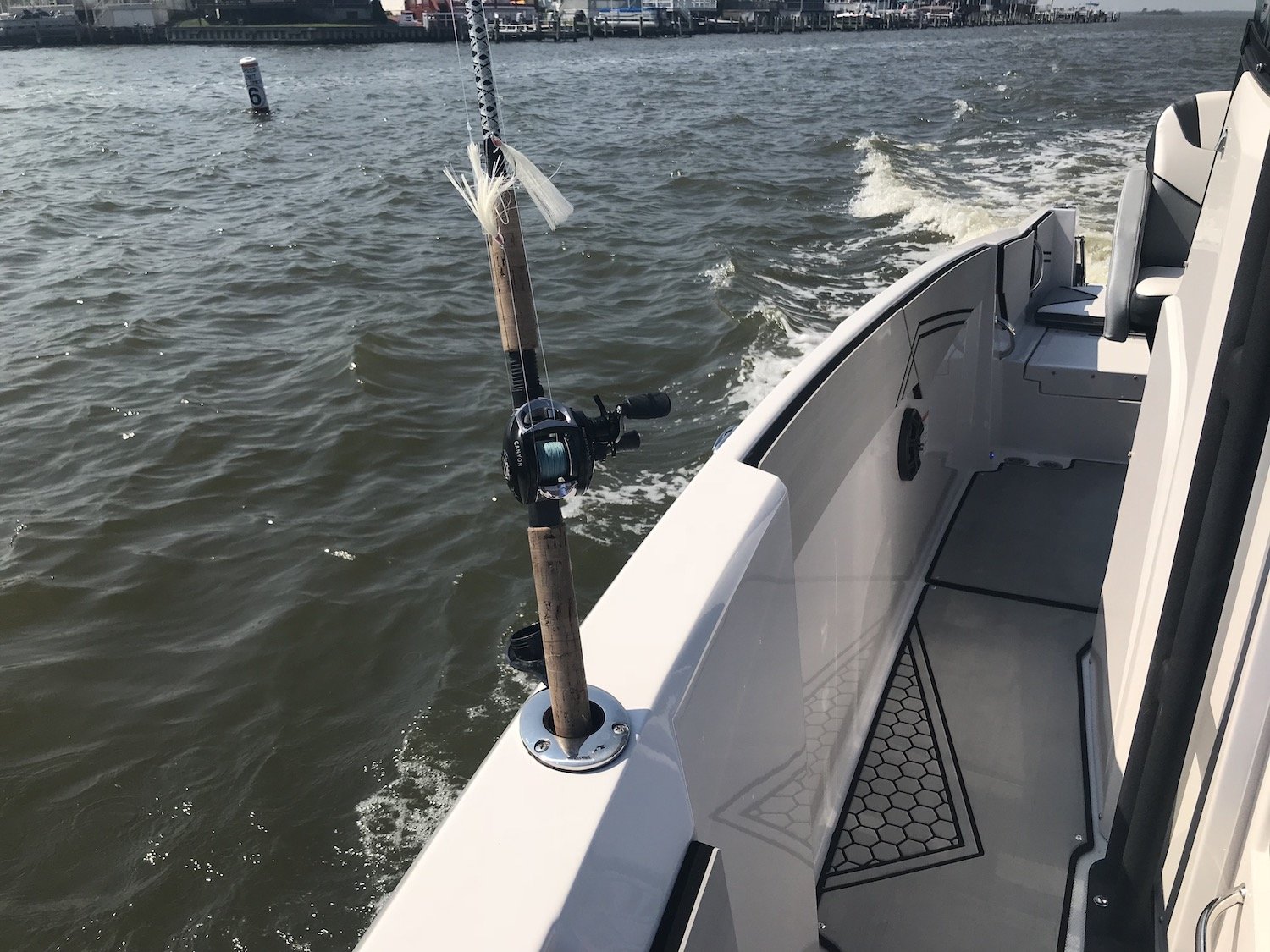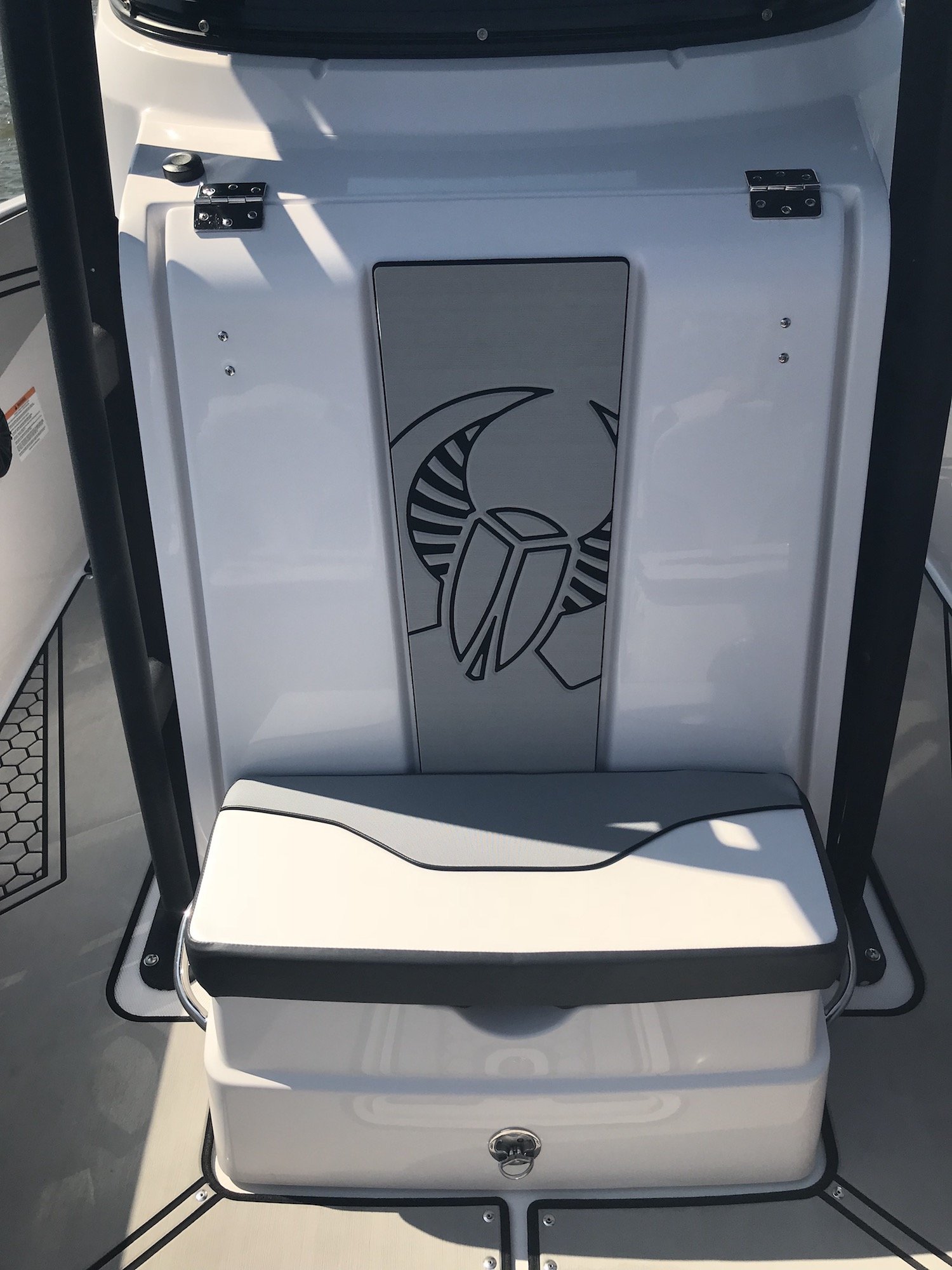 This particular model had the exterior, interior walls and deck covered in MarineMat so it was very comfortable on the feet and was installed with snaps so you can remove and replace it if you take it out fishing and don’t want to bloody it up. There were several rod holders on the boat, some that doubled as cup holders, there were lots of comfortable seating options and there is even a stand-up room head under the center console.