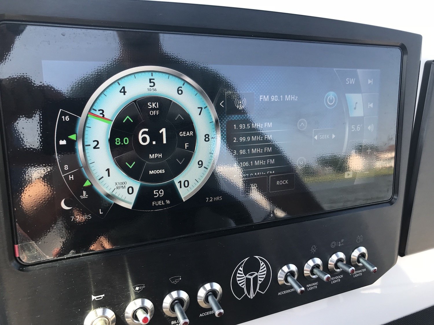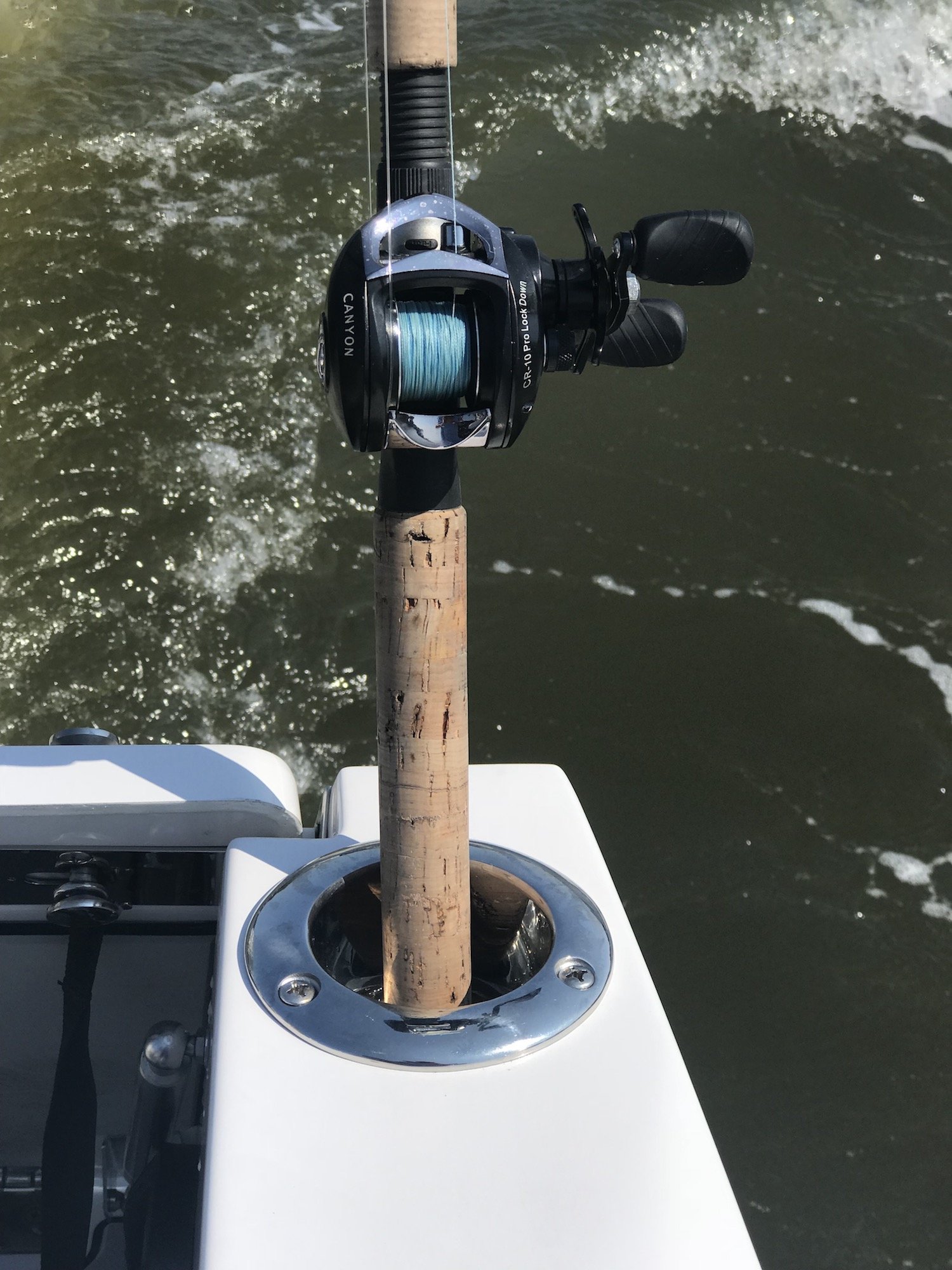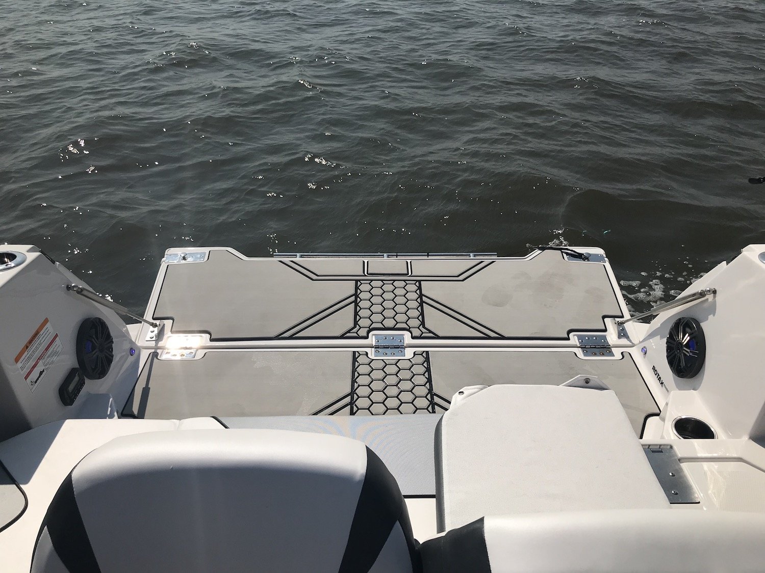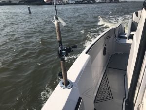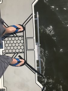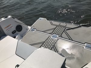 The coolest part of this rig for me was the drop down transom that you have to see to believe. Because this boat is a jet drive with no outboard to get in the way Scarab was able to allow for a transom that can be lowered to just above the water line. This allows for easy access back on the boat, a spot to launch crab traps, tubes or skiers, or another spot for a couple of anglers to drop a line (as long as their careful.) The transom is super easy to lower and raise and it’s sturdy enough for a 200 pound man to stand on with no problem….trust me on that one.