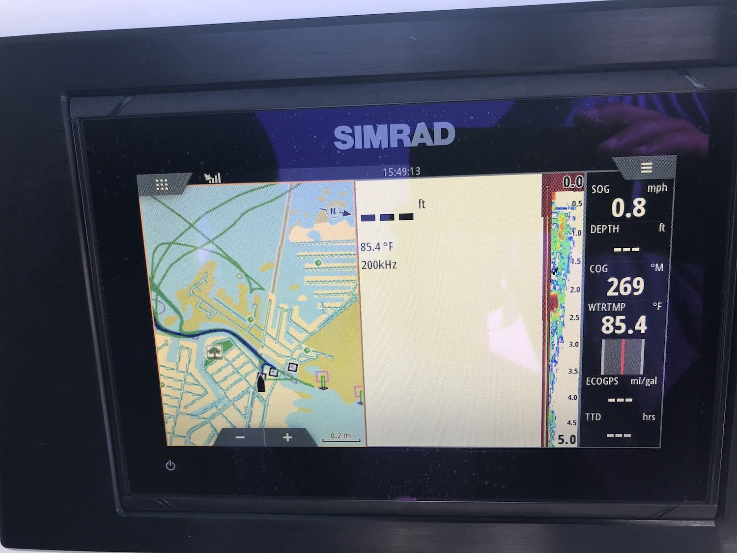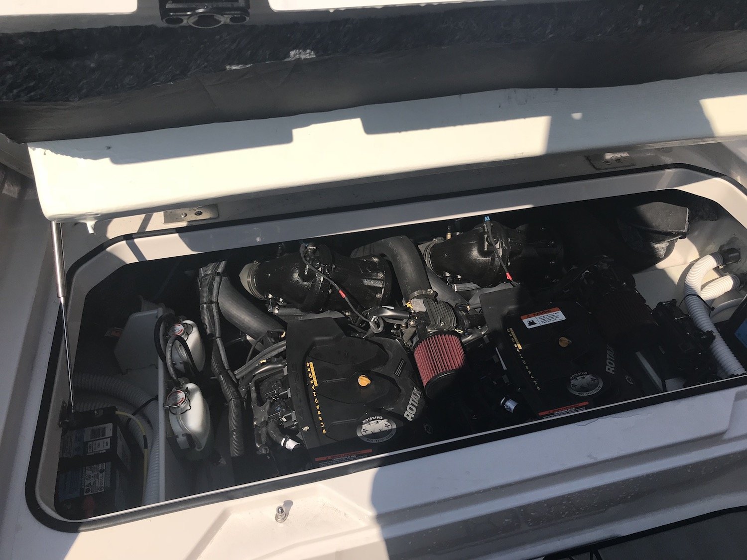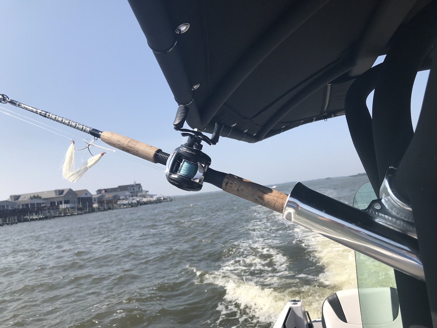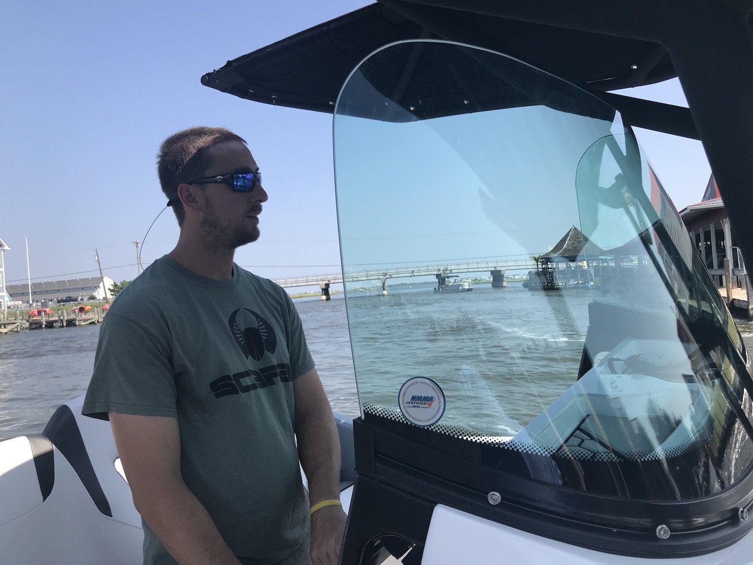 The coolest part of this rig for me was the drop down transom that you have to see to believe. Because this boat is a jet drive with no outboard to get in the way Scarab was able to allow for a transom that can be lowered to just above the water line. This allows for easy access back on the boat, a spot to launch crab traps, tubes or skiers, or another spot for a couple of anglers to drop a line (as long as their careful.) The transom is super easy to lower and raise and it’s sturdy enough for a 200 pound man to stand on with no problem….trust me on that one.