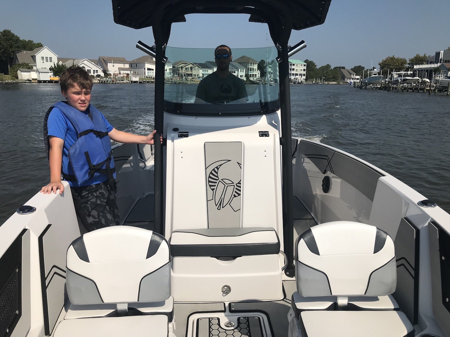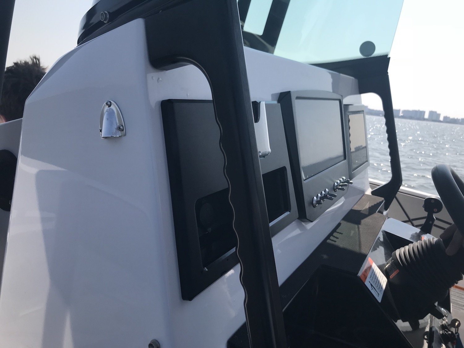The inside of the boat is plenty roomy enough for 4-6 people to fish comfortably and 10-13 to cruise….that is if you call 50 mph cruising. Top speed is 58 mph depending on the weight, and Mike told us to “hold on for a second” and had us to 50 mph in about 10 seconds. The 500 HP engine gets you out of a hole quickly and the boat handles really well even in a slight chop. You don’t have to worry about crab pots and other things as much either thanks to the shallow draft and lack of lower unit and propeller. The 25′ Open has a nice, sleek console and the availability for a sick electronics package and a comfortable helm post with adjustability that can fit three people.