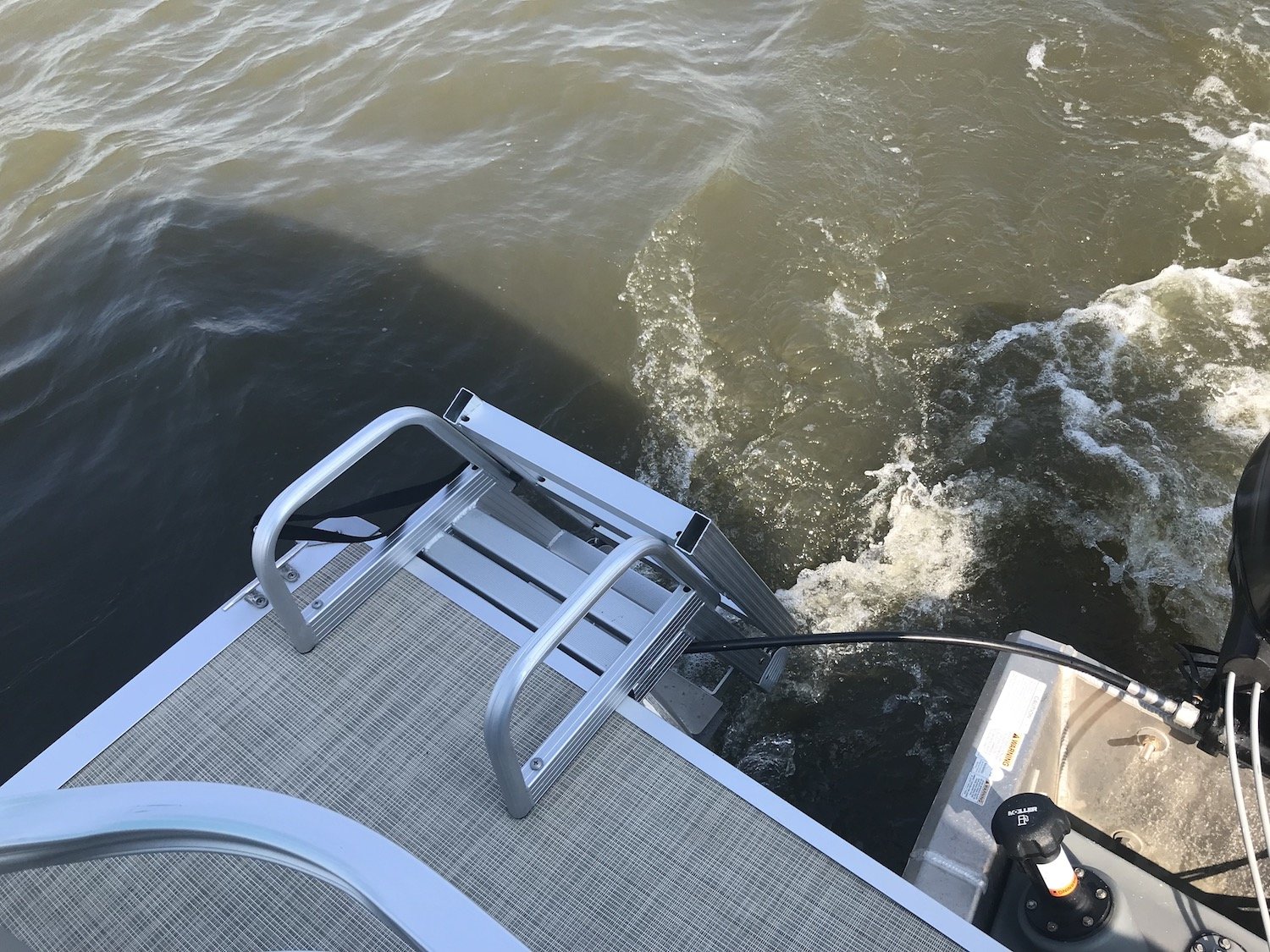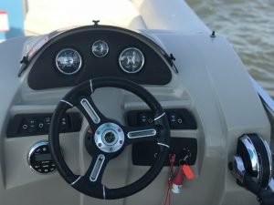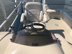 The boats have plenty of really comfortable cushioned seating with under seat storage, a canopy for cover from the sun, a swim ladder off of the back for easy access back to the deck if you decide to go swimming, tubing or water skiing and a super comfortable helm station with easy gauges and controls.