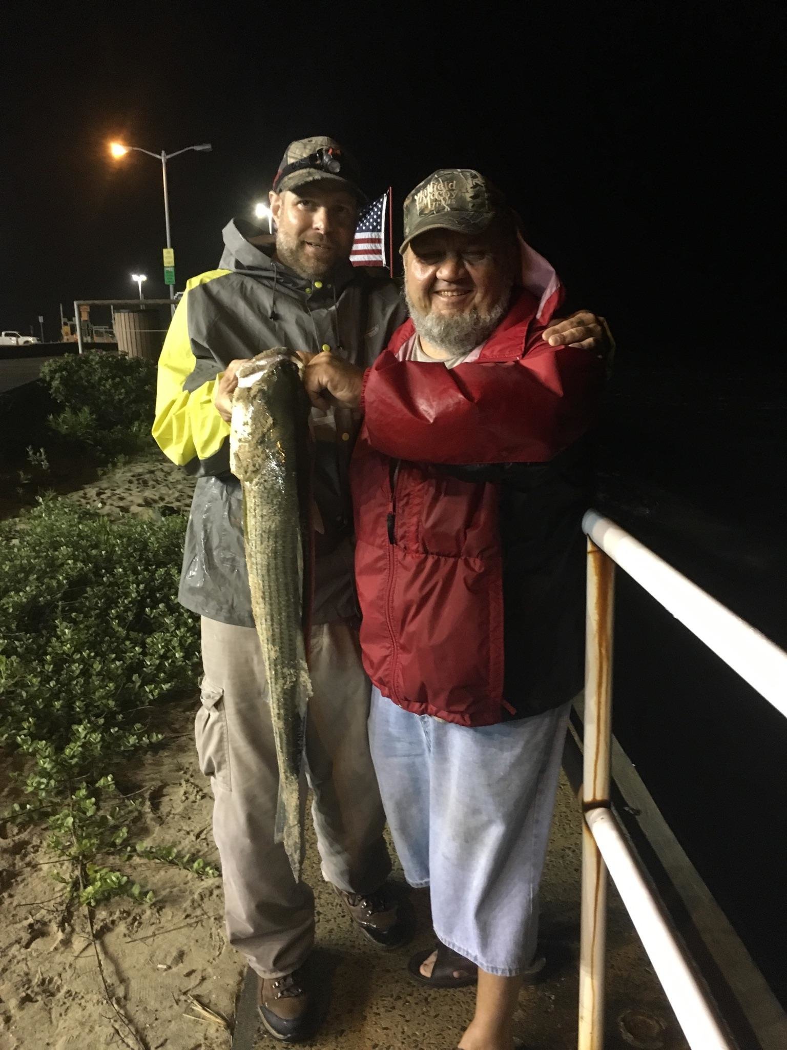 Brandon from Pennsylvania caught this 37″ rockfish on the wall behind the Oceanic Motel on one of the Oceanic Pier’s “Midnight Madness” finger mullet.