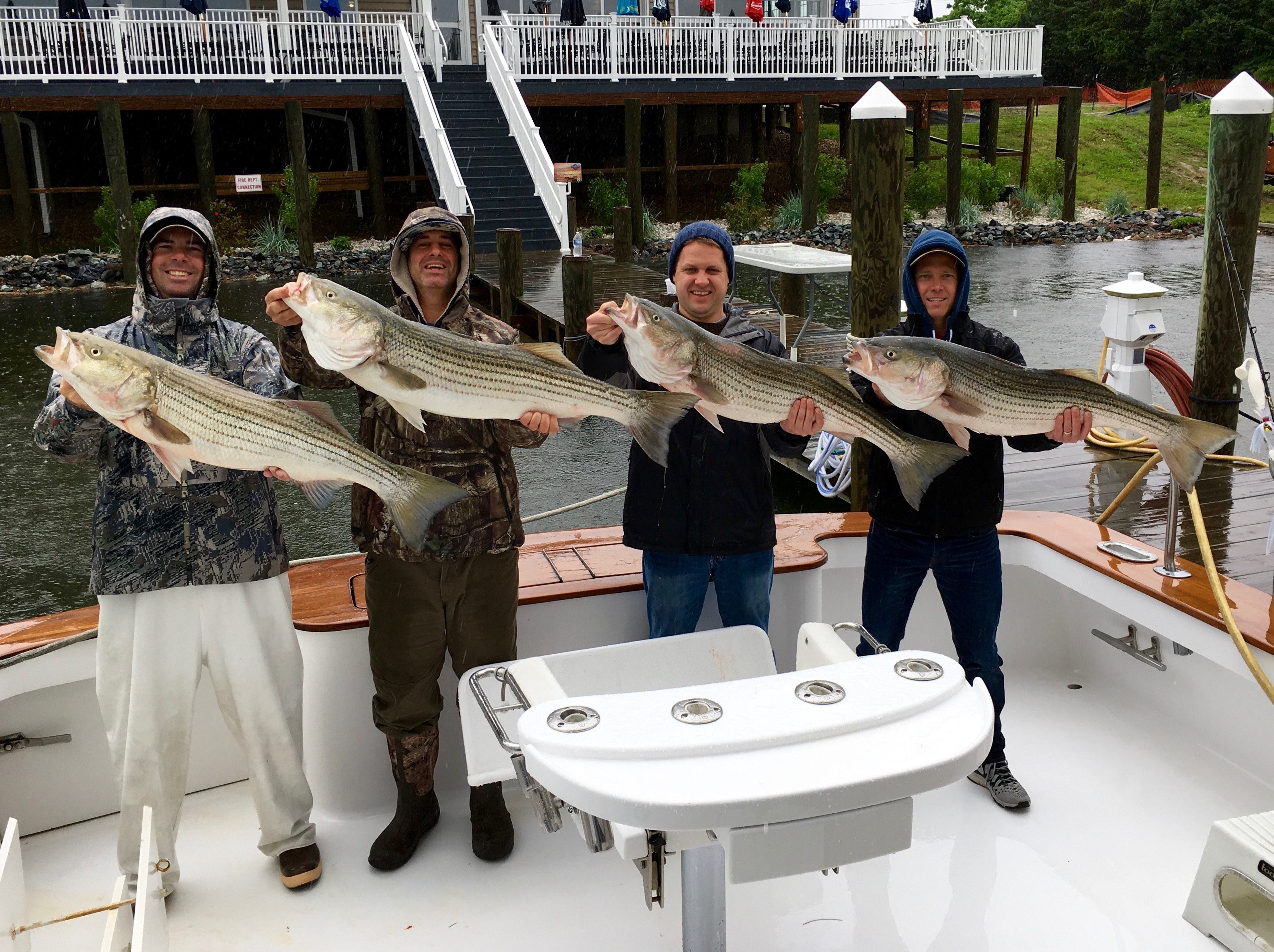 Tom Distefano and his crew braved the elements over on the Chesapeake Bay today with Captain Mark Hoos and mate Mark Stephens on the Marli and were rewarded with a limit of trophy rockfish. The crew also released six other big stripers on the trip. Captain Mark is available for charter over on the Chesapeake on Monday and the weather looks pretty decent. Check Marli out here if you’d like to book on short notice. http://fishinoc.com/offshore/marli/ You can also check Marli’s exploits out on Instagram @marlisportfishing.