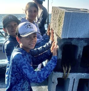 Carter, John & Caitlyn gave today’s reef blocks a shove atop Brian Sauerzopf’s Memorial Reef. A new site for our drops, I think it will benefit.
