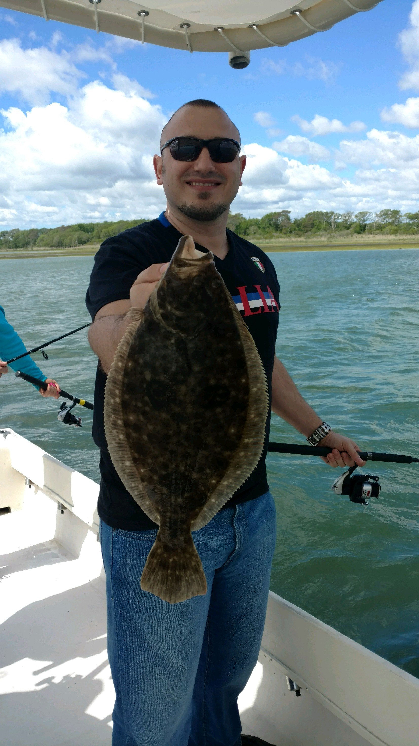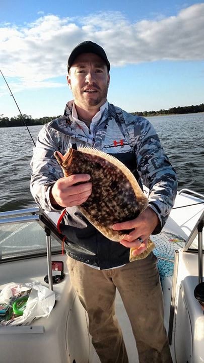 Captain Jason Mumford of the inshore charter boat Lucky Break was able to take advantage of the lighter winds on his trip this morning. Captain Jason was able to put his crew on two bluefish and one 17″ keeper flounder on a Zman white paddle bait.