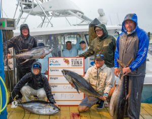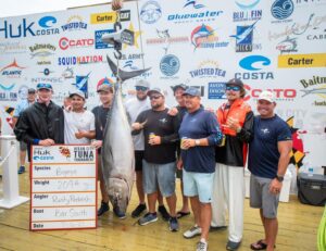 I just got back from an awesome night under the tent where lots of money was handed out to the winners of the Ocean City Tuna Tournament and everyone had a great time. We had two completely different weather days as when scales opened at 4 PM it was a deluge with pouring rain, and then when scales closed at 7 PM it was sunny and beautiful. It was a terrible weekend of weather on the ocean with rough seas, but it was an awesome weekend of fishing. In the end the crew of the Cabana with Captain Eddie Wheeler were the big winners taking the Winner-Take-All Pro Jackpot in both the heaviest stringer and heaviest single fish categories. This got them a check for over $495,000. Congratulations to the crew of Cabana, all of the other winners in the OC Tuna Tournament and to Rolfe Gudelsky, Brian Tinkler and the team at the OC Fishing Center for an awesome event!! Here are the winners of each category.