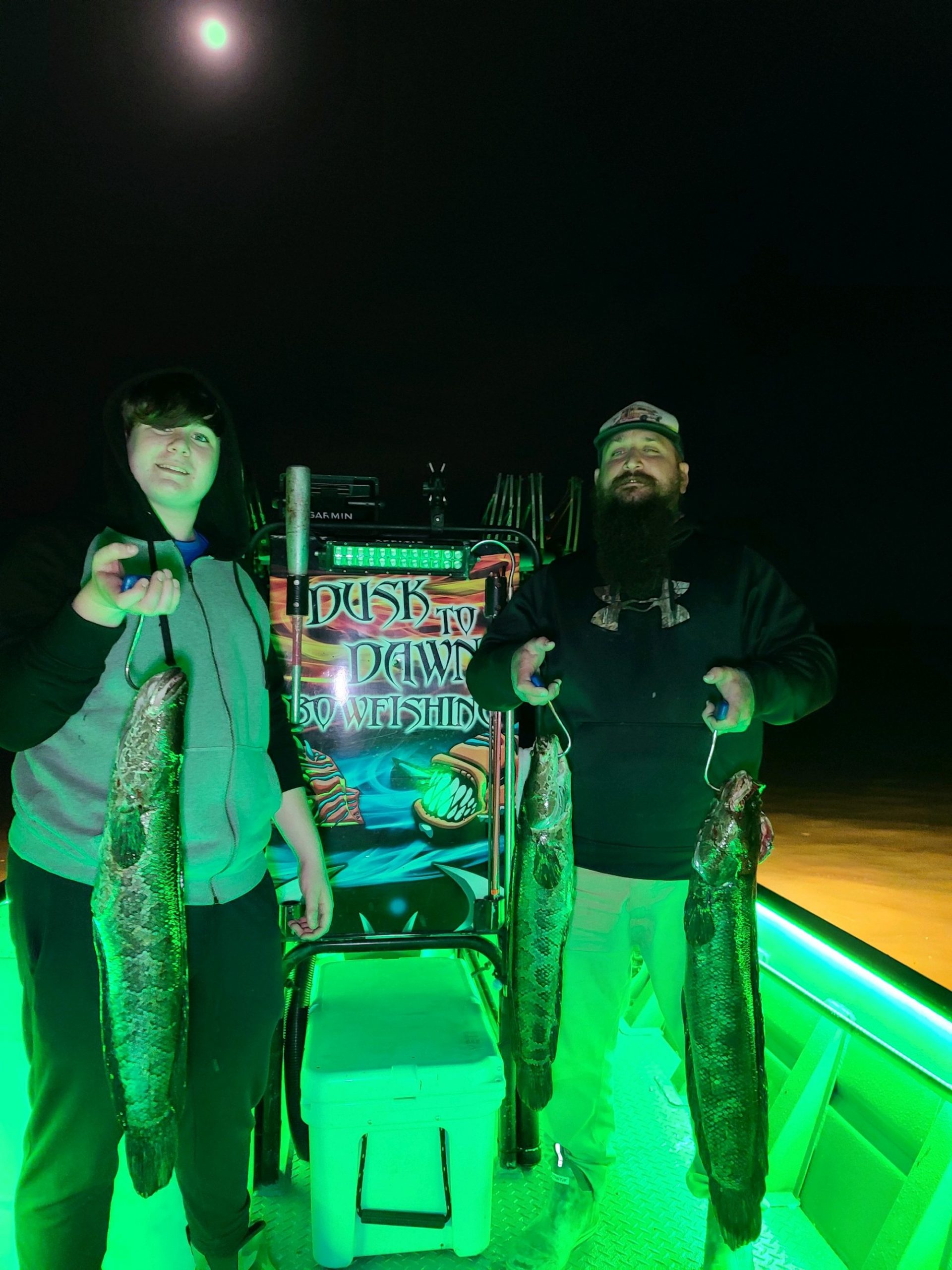 Captain Marc Spagnola of Dusk to Dawn Bowfishing had another good night last night putting his shooters on snakehead and gar under the stars.