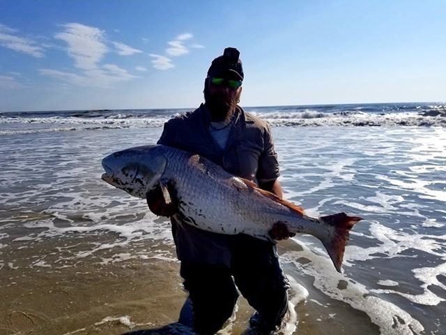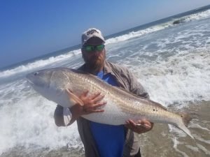 David Moore has been having some terrific luck on the red drum in the Assateague surf recently. First fish is a big 54″er and second is a HUGE 55″ fish with a 30″ girth. The big drum was estimated at over 70 pounds and if not for the 27″ maximum size could very well have been a new state record.