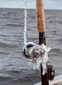Twenty three degrees at the dock. No perceptible wind. Found a breeze clearing the inlet, but not yesterday’s gale. Wind shifted from N to NE on our way out. A frozen slurry making on deck; rigged rods to windward were icing up – it’s chilly.
