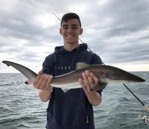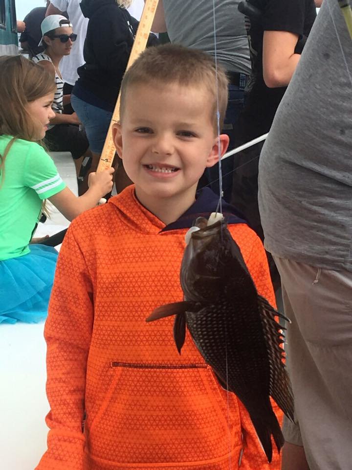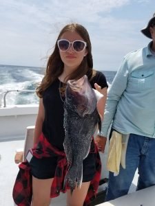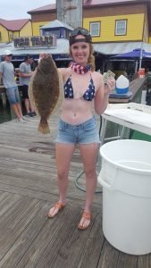 Captain Drew Zerbe of the Tortuga gave Cait Nichols from Boyerstown, PA a squid and shiner combo and she turned it into this 17 1/4″ keeper flounder that was the afternoon pool winner. Net men were mates Serge Garder and Matt Harris.