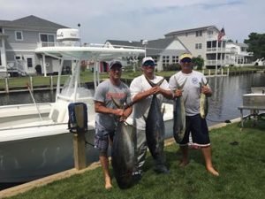 Carl Bittenbender submitted the below photo of his crew from the First Due out of South Bethany reported a mixed bag from just west of Massey’s Canyon caught between 8 and 9 am. The crew caught mahi and tuna with one weighing a big 60 pounds.