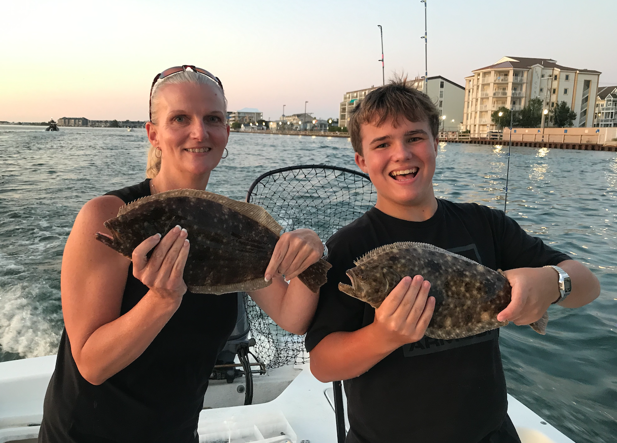 I haven’t had a chance to get the Fish in OC skiff out much lately as busy as I’ve been so it was nice to get out this evening for a few hours with my wife Kristen and my son Ryan. We had a beautiful evening with the last of the incoming tide and they…..yes they caught some fish. I’ll have to listen to it at the post office and the bank I’m sure because now my kid is officially catching more fish than me……and I couldn’t be more proud! Kristen and Ryan did a great job catching a few throwbacks and these two keepers of 16 1/2″ and 17″ in the east channel. We used our Dale Timmons’ Deadly Double rigs in chartreuse and they tried the new Gulp 6″ grub in salmon red that I picked up from Atlantic Tackle the other day and that’s what produced the two keepers. It was a great evening on the water with my peeps!