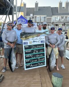 Day four of the 50th Anniversary of the White Marlin Open is in the books and not only have no billfish qualified, none have even been weighed. That’s right, zero billfish have been weighed and if that holds true through tomorrow night at 9:15 it will be the first time in the history of the White Marlin Open that no billfish were weighed. One other thing that would happen if there are no qualifying billfish is that money in added entry levels that totals over $7 Million dollars would “trickle down” to the tuna category. If no qualifying white or blue marlin is caught on day 5 most of the over $7 Million that is currently reserved for billfish could be paid out to bigeye tuna currently on the board. Either way, it’s going to be an exciting day of scales action with over 350 boats strategizing to get their piece of the $10.5 Million that is on the line…..literally!! Watch it all unfold live at www.whitemarlinopen.com. Here’s who’s leading what after four days of fishing.