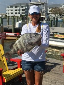 Adam at Bahia Marina sent this photo of Sue Ann Caruso who landed a nice 7 pound, 4 ounce sheepshead on a sand flea while fishing at the north jetty.