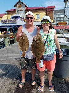 Captain Drew Zerbe of the Tortuga had some decent fishing today inside of the inlet. Eddie Dann from Verona, NY and Amy Schindler from Parkville, MD display a couple of nice fish caught on shiner and squid combos today. Amy’s fish was larger at 20 1/2″, 4 lb. 1 oz and is the new season-long Derby Leader. Both fish met their demise by the net of mate Serge Gardner.