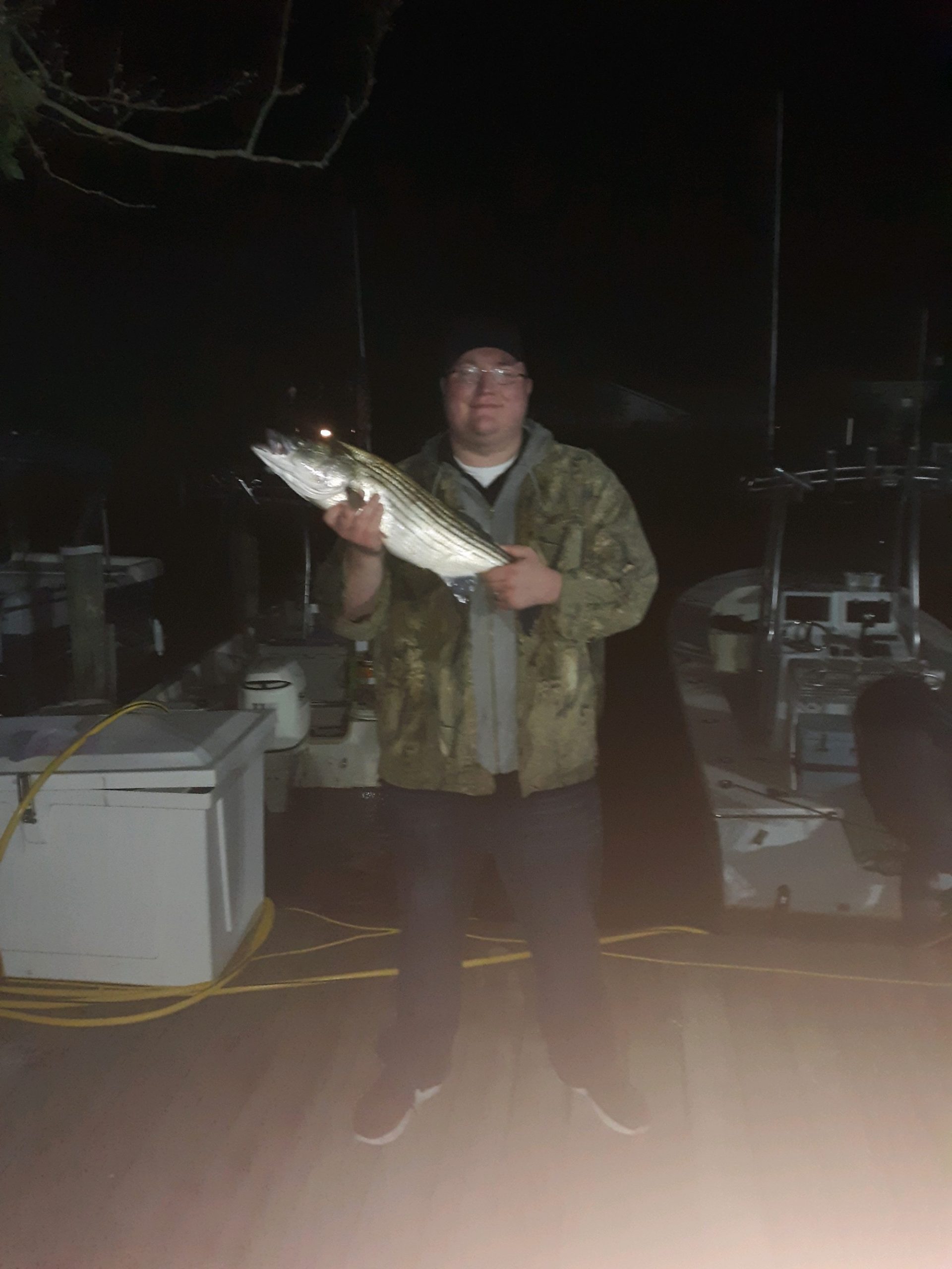 Last night Captain Wayne Blanks of Bayside Guide Service braved the windy nighttime conditions and hit the route 50 bridge for some casting and had a good night of catching for his anglers. Captain Wayne put his guys on several rockfish in the 20″-26″ range and also had this 29″ keeper.