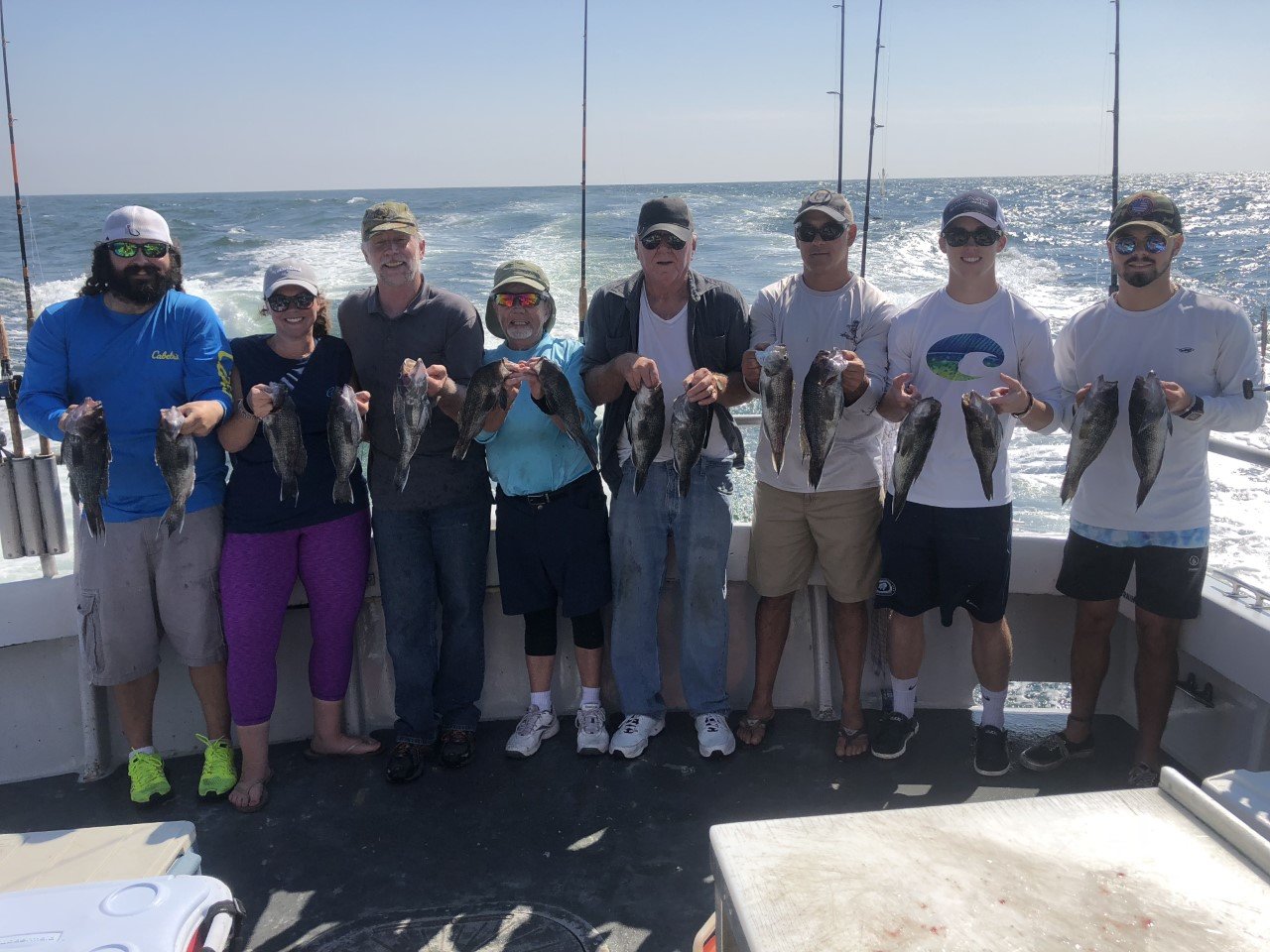 Ocean bottom fishing was impressive again today with Captain Monty Hawkins of the Morning Star posting yet another boat limit on sea bass. Michael Gilbert, MD from Glen Burnie took top honors today with a 17″ sea bass and also pictured are Nicky Ferrara of Middletown, DE – Mike DeGenova & Nick Ferrara of Elizabethtown College – Stacey Chaney – Mark Boyd of Milton, DE – Bill Gerber from Cambridge, MD – & Fleming Hanson of Ocean View, DE. Captain Monty says he’s got plenty of room on Sunday, Monday and Tuesday for what looks to be some really good weather.