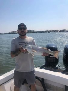 Captain Chase Eberle of Chasin’ Tides Charters was back to charter fishing today and had some luck fishing the south jetty. Captain Chase put this lucky angler on a slot red drum that was 24″ and able to go in the box.