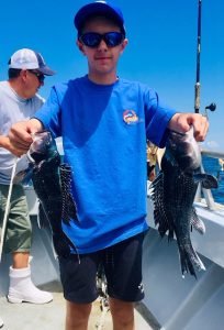 Young Alex Rodriguez of McLean VA has been fishing with me a number of years. Holding up a nice pair of bass, looks like he’s learned how to do it.