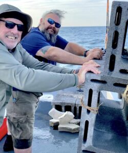 After a wonderful sunrise we dropped our blocks on Al Berger’s Reef. Still using my favorite xxl “Tog Condo” chimney blocks. I honestly think they’re the best boat deployable manufactured reef unit. Stacking em up there. Have to put Nick Caloyianis on it in a couple years for some professional video & stills..