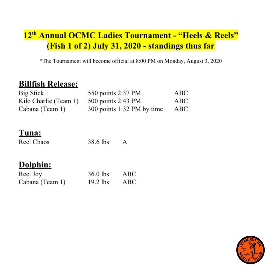 Today was day one of the Ocean City Marlin Club’s Heels $ Reels ladies only tournament. This is a great tournament for our female anglers and lots of teams also use it as a practice run for the White Marlin Open. Here’s who leads after one day of fishing. Thanks to Dave Messick and Amanda Shick for the photos!