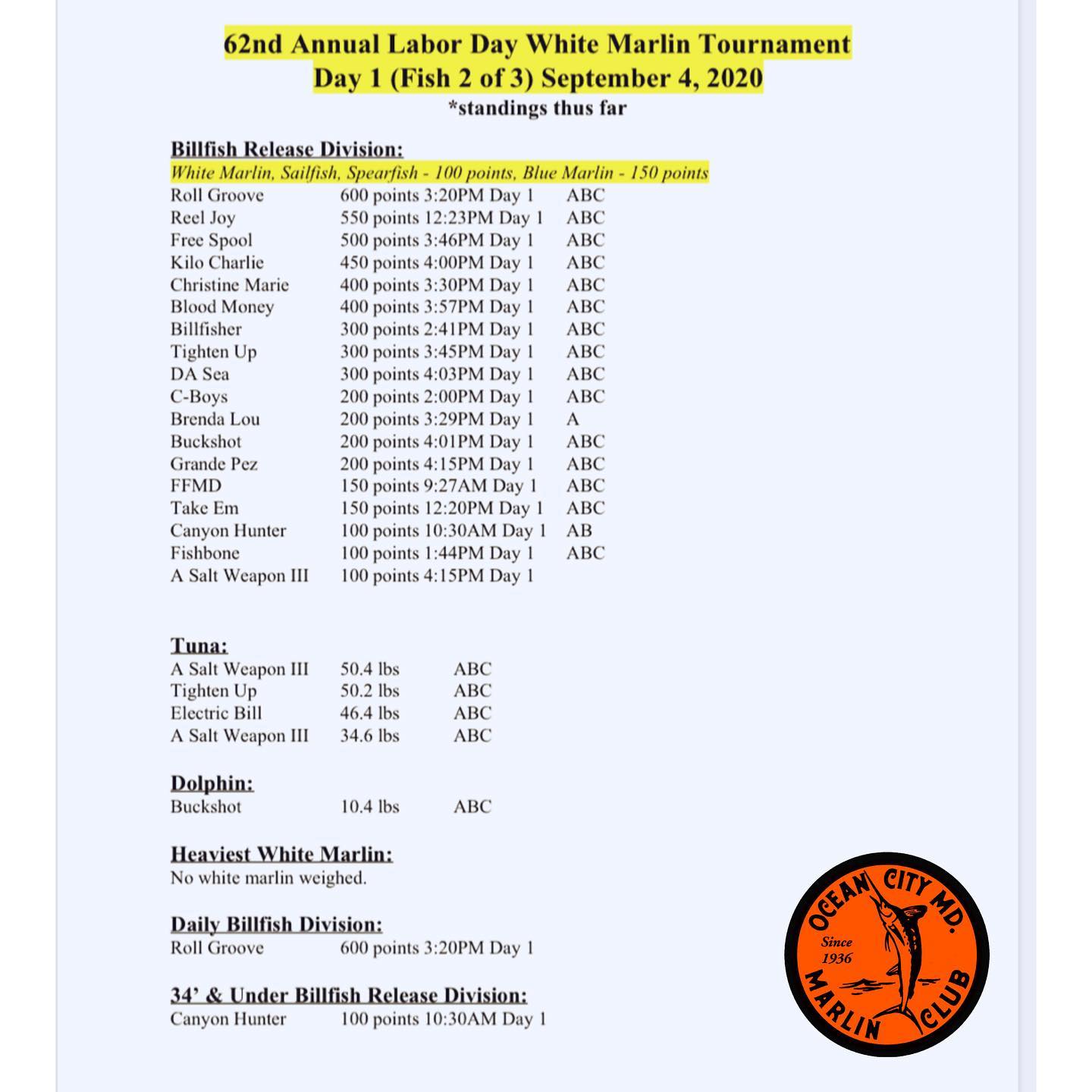 Today was day 1 of the Ocean City Marlin Club Labor Day White Marlin Tournament and there was some good fishing to get things started.  Fish in OC charter partner Roll Groove is currently sitting in the lead in the billfish release category with two days left to fish.  Thanks to Amanda Shick for the pics!
