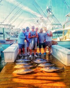 The crew of Boss Hogg had another great day of trolling with a pile of yellowfins for the fish cleaners at Sunset Marina.