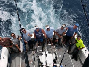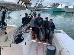 The crew of the private boat Redemption had a crazy good day of tuna fishing in the Poorman’s Canyon. The crew had 8 bigeye tuna and two yellowfin tuna and also released a white marlin.