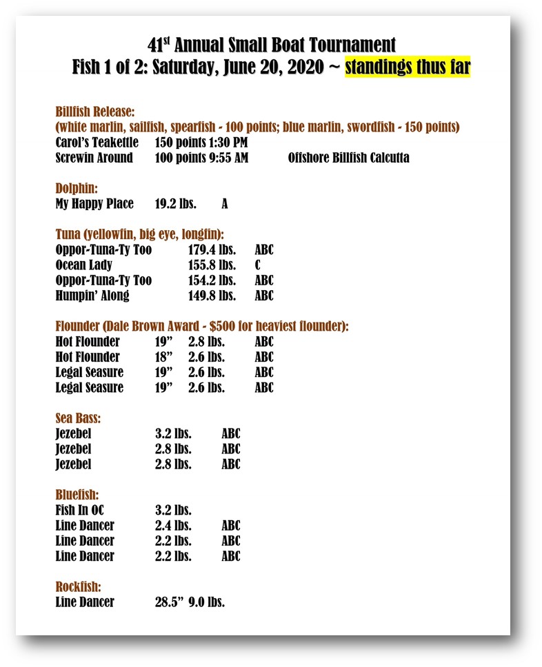 Our bluefish is actually on the leaderboard for Day 1 of the OCMC Small Boat Tournament and here are the rest of the standings after the first day of fishing.