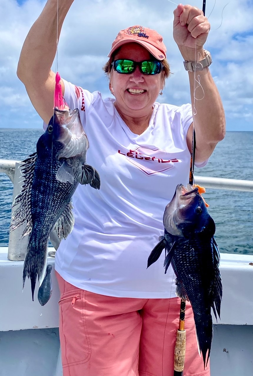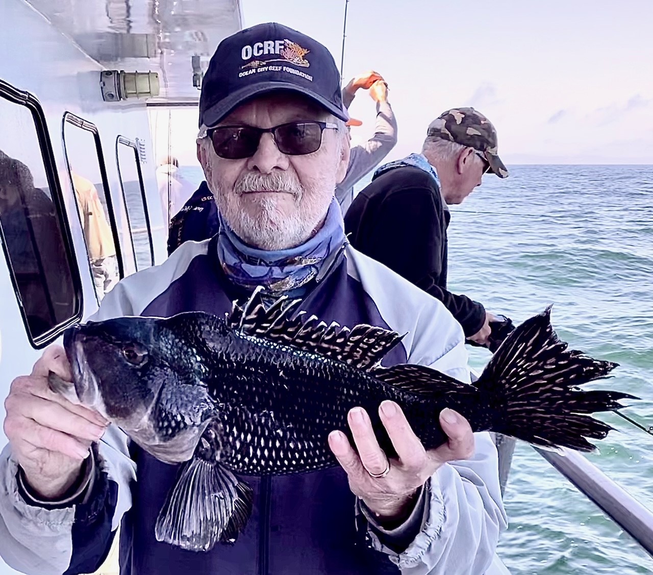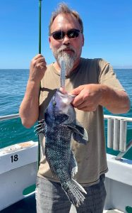 Sure had some nice cbass. Jigmaster Tom was high hook on this picturesque day with 13. A number of anglers were in double digits. “WF” had the trophy for ‘most improved’ (and enough about that!) Among a few other long time regulars aboard was Flounder George. While he took the pool with one of the day’s first fish, I’ve had concerns for his monicker of late. There was relief when I saw a net going down the rail – then dipped.