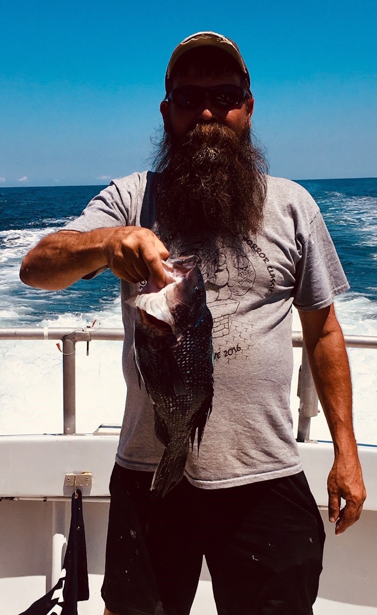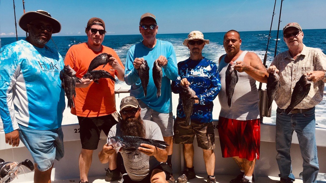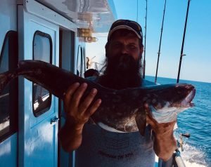 Scott Raleigh of Elkton MD took everyone’s pool money with a 19 inch sea bass. He’s also shown holding up a white hake caught by another angler who may or may not have called in sick to work today.