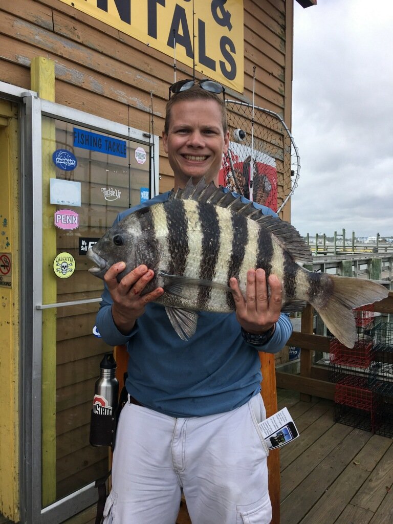 Things down at the Oceanic Pier have been heating up as we get into the fall and Bear has been keeping me abreast of the situation. Steve caught a 25″ sheepshead from the north sea wall today that weighed an even 13 pounds, and Jordan from Camden, DE caught a 27″ red drum and a keeper sheepshead on live sand fleas.