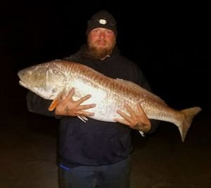 I got this photo from David Moore who was fishing by himself on Assateague Island the other night when he caught this big old 50″ red drum and released it.