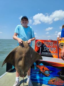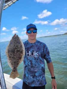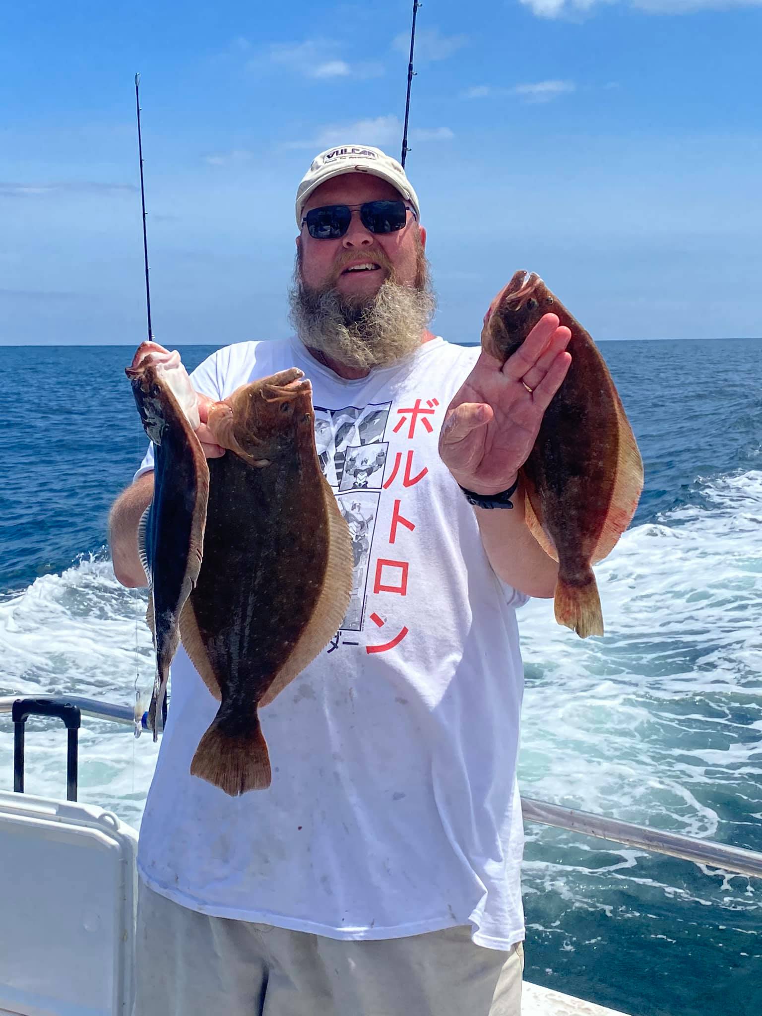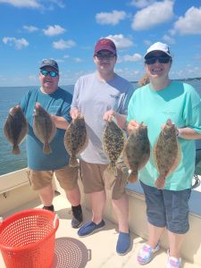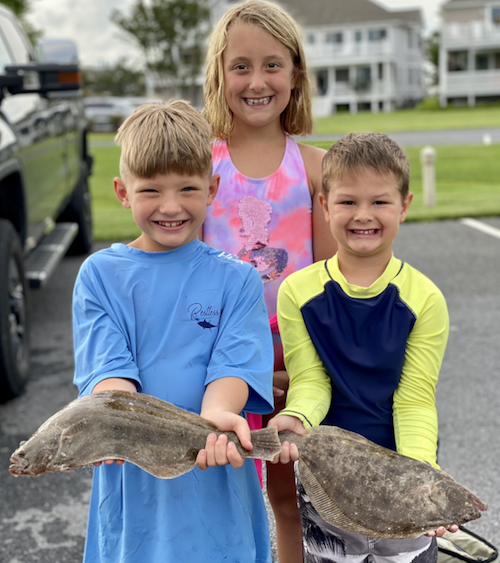 Sean Dieter and William Boyd pictured with net master Flynn Deiter landed keeper flounder while fishing the east channel on board Patrick Deiter’s Pull and Play using the Fish in OC Deadly Double baited with 4″ Gulp swimming mullet.