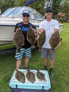 Jordan Helsel put his friends on some keeper flounder today behind Assateague Island using the Fish in OC Deadly Double with Gulp and live minnows.