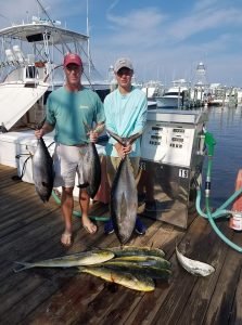 Captain Luke Blume and mate Jon Henry of the C Boys had a “decent day” today. Captain Luke trolled the Poor Man’s Canyon today and put his anglers on three keeper yellowfin tuna and some mahi. They also pulled off a white marlin.