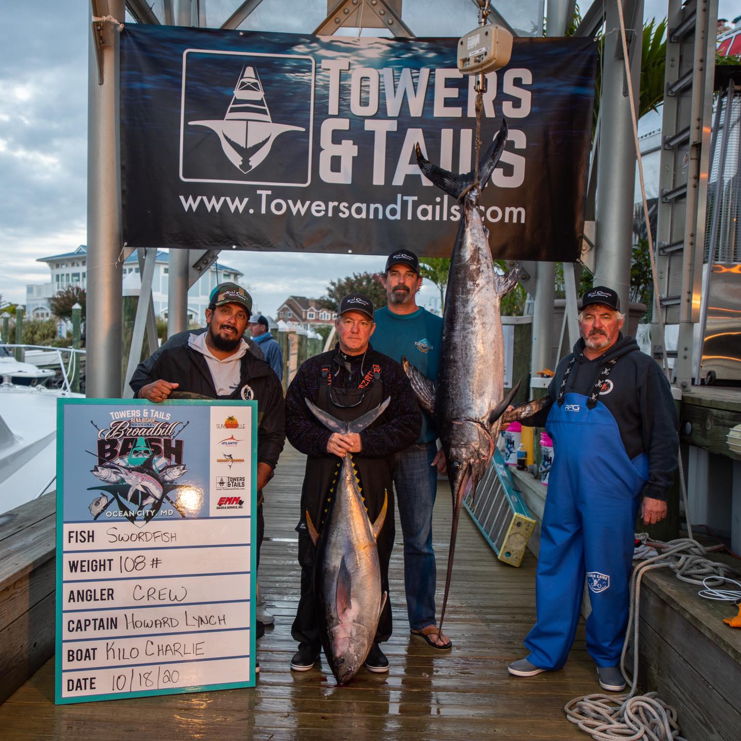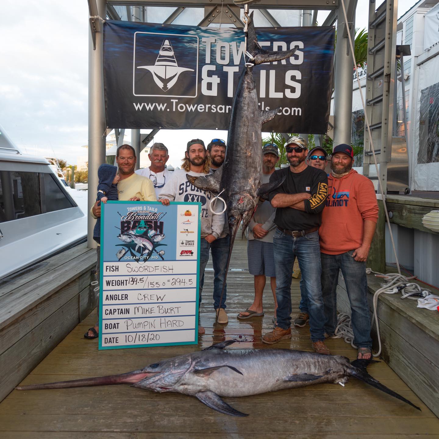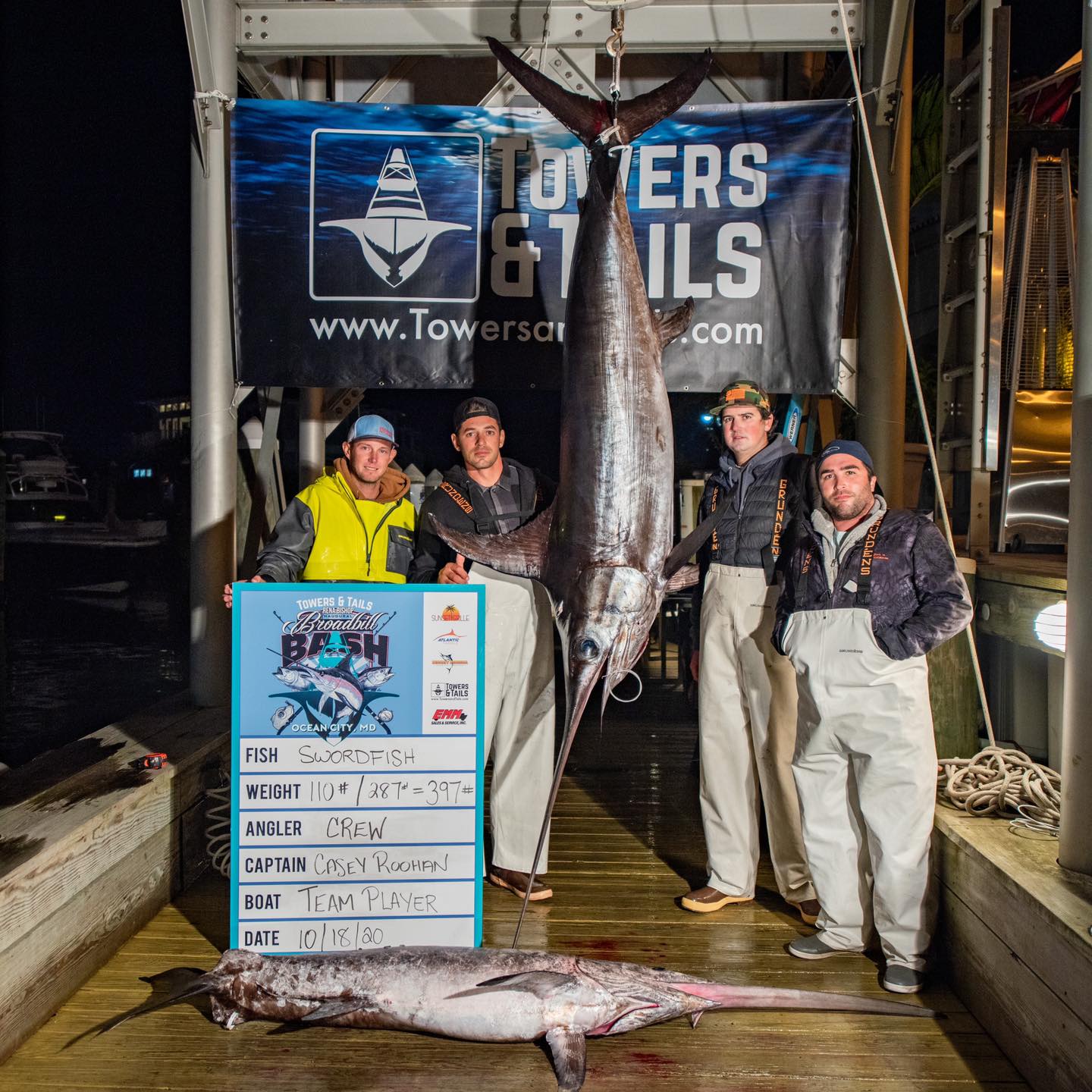 I had the pleasure….well kind of pleasure of fishing on board the Fish On today with Captain Andrew Dotterweich and crew for their second and final day of the Inaugural Bishop Broadbill Bash. I say “kind of pleasure” because it was snotty rough and those kind of conditions and me just don’t get along. We did put a 160 pound swordfish in the boat and the crew did a great job in the challenging conditions. This is the first swordfish that Dave Messick and I have had caught in an episode of Hooked on OC in the 16 years that we’ve been doing the show so that is exciting. The Fish On adds this 160 pound sword to their 358 pounder from Friday and now holds first and third place in the heaviest swordfish category and first place in the stringer category with 518 pounds. Second place in the heaviest swordfish category is held by the crew of the Team Player with a nice 278 pounder. The tournament has been extended through tomorrow due to rough seas this weekend so good luck to those crews fishing tomorrow. Thanks to Jake Widgeon for the pics!