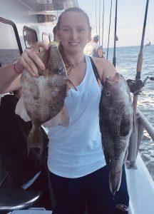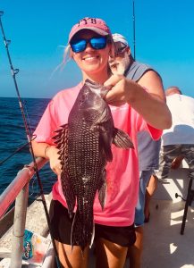Katie Larrimore, from Chestertown MD & here holding one of her better cbass, (pink) made a fine student of sea bass fishing.