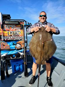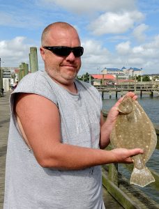Bob Haltmeier of the Oceanic Pier was in the right place at the right time to capture this photo of a guy that had just caught a 17″ keeper flounder from the pier.