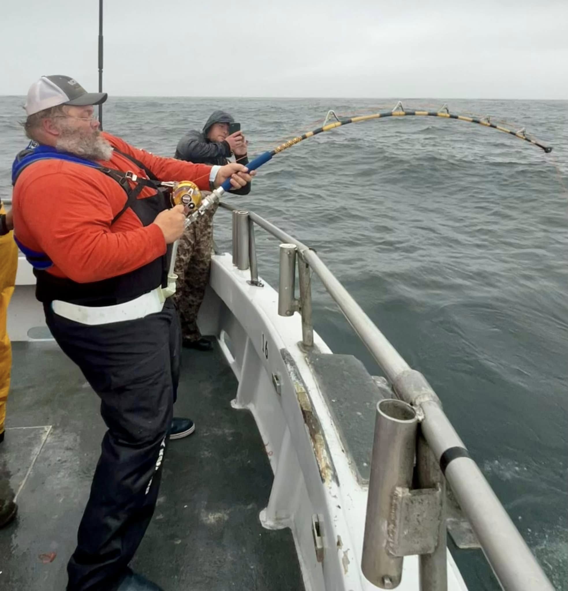 Exhilerating when headed for London; our second fish dumped a lot of line on the strike; had bitten a wayback to begin with so perhaps 400+ yards of line out! After several rounds of anglers it took 43 minutes to slide over the rail..