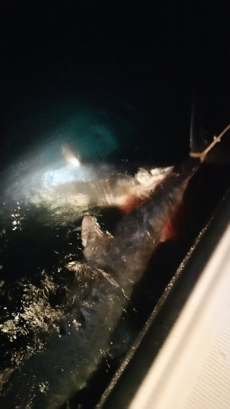 Austin also caught a cool picture at night of one of his mako releases taking a bite out of their dead mako while it was hanging beside the boat……Gnarly!