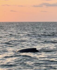 Dern sure didn’t get too far before mate Vic saw a small humpback whale in full breach hard to starboard. Scarcely a mile off the beach; never did see the little fellow breach again. He was sure making vigorous circles though. Learned from momma; the whale was keeping a large school of menhaden knotted up for easier feeding. I bet when it did breach it was to spook the bait into a tighter shoal.