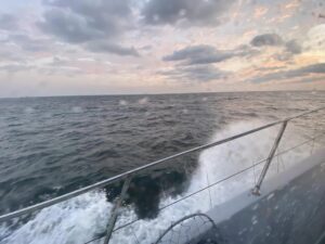 Sun coming up as we cleared the inlet, a bit more sea was revealed than I’d anticipated. Checked all my forecast sites – each foretold decreasing winds as they had previously.